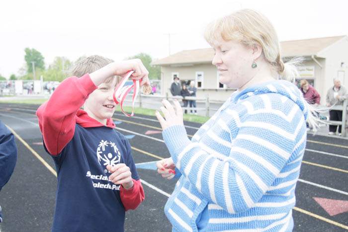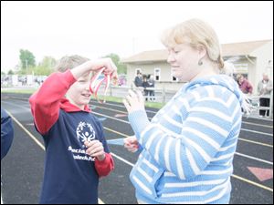 Addison Daoust 13, of Toledo, left, shows his medal to his mom, Megan Daoust, after taking first in the 100 M dash.