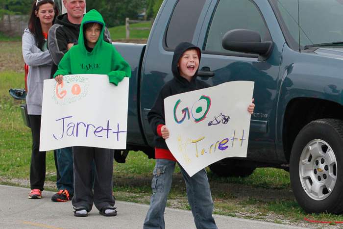 Fans for bicyclist Jarrett Brann [not pictured], cheer for him as he near's their turn. They are, from left: Heather and Josh Auxier, Mason McQueen, 12, and Xander Shiffert, 9.