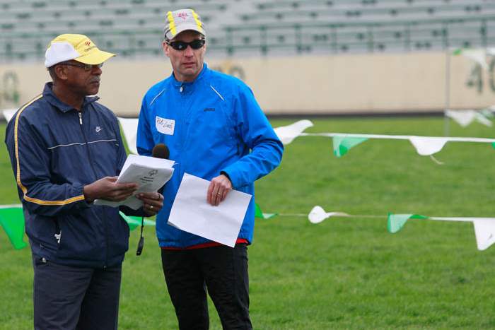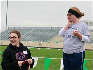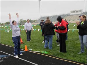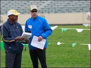 CTY olympics12p Special Olympics volunteers Norman Thomas, of Solon, left, and Rob Loeb, of Toledo, before the startof the track events. More than 400 athletes from Lucas, Wood, Fulton, Defiance, Erie, Sandusky, Williams, Ottawa, and Paulding counties compete in the annual Special Olympics Area IV games at Clay High School in Oregon, Ohio on May 11, 2013. The Blade/Jetta Fraser