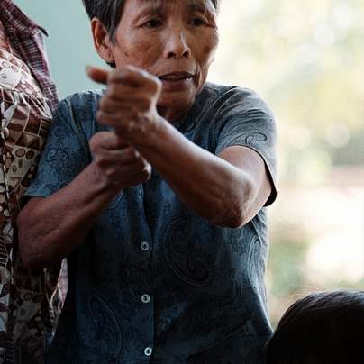 July 31, 2003-- Running through a rice paddy in 1967, Nguyen Thi Mai, 70, left, had her left hand shot off by US soldiers in a helicopter.