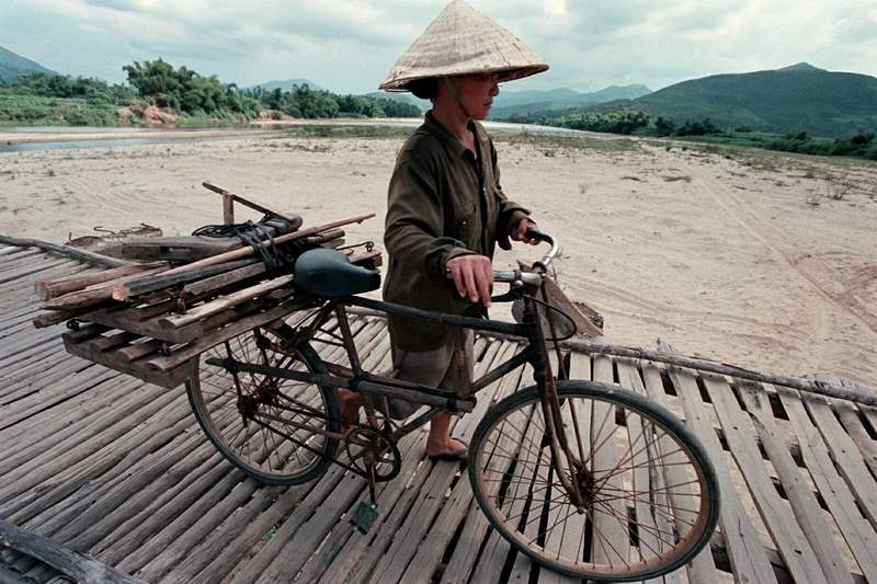 August 3, 2003-- A woman pusher her bicycle over a hand-made bridge stretching across the Song Ve River.