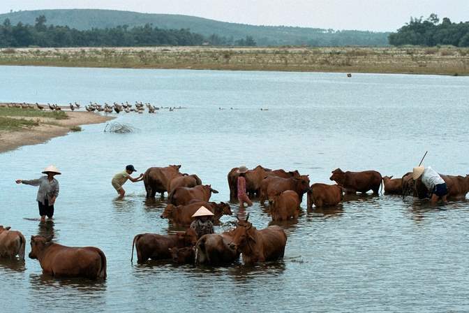 August 2, 2003-- Farmers and thier children wash their cattle in the Song Ve River.