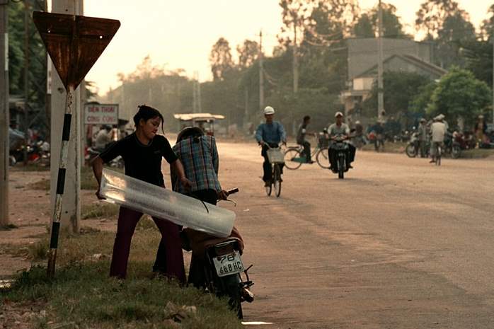August 3, 2003-- Ice is delivered on the back of a motorbike in Quang Ngai City at a little after 5 o'clock in the morning. The days begin early in Quang Ngai City like the rest of Vietnam.