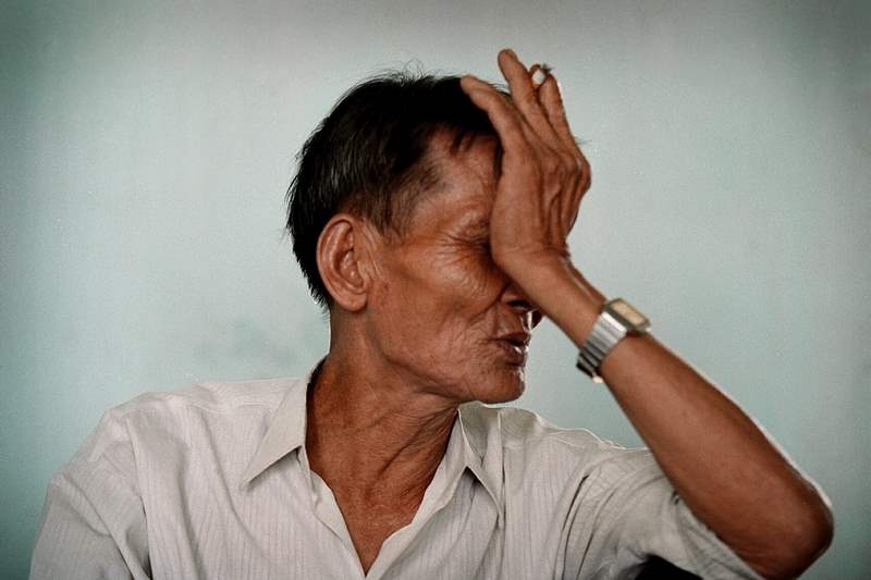 July 31, 2003-- Nguyen Hong Dien wipes away a tear as he describes his wife. Nguyen Hong Dien was a Viet Cong soldier hunted by Tiger Force in 1967 in the Song Ve Valley, Quang Ngai Province, Vietnam. Unable to capture him, Tiger Force members killed his wife Le Thi Thuong in a bunker and left his infant daughter Nguyen Thi Que in with the body.