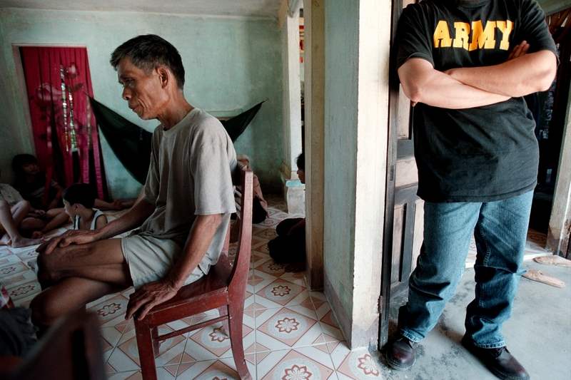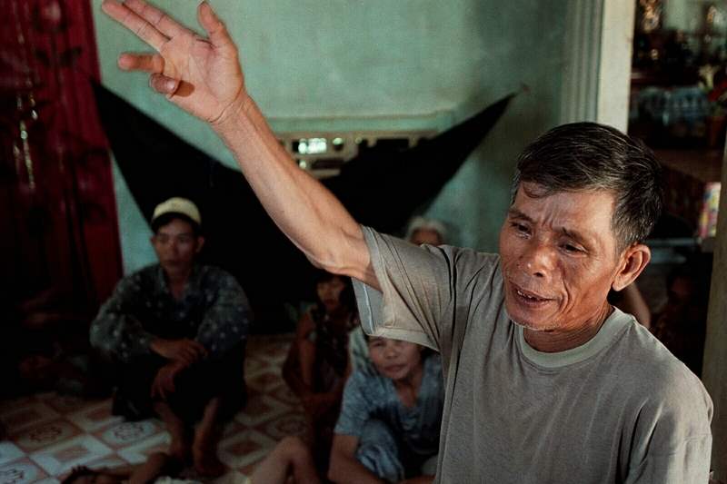 July 31, 2003-- Sitting in his home, Nguyen Dam recalls witnessing two boys killed in 1967 in the Song Ve Valley of Quang Ngai Province, Vietnam.