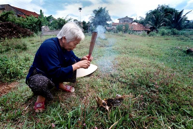 July 31, 2003-- A devout Buddhist, Tam Hau prays at the unmarked grave of her uncle Dao Hue in the Song Ve Valley of Quang Ngai Province, Vietnam. Tam Hau and her nephew Bui Quang Truong retrieved the body of her uncle, killed by Tiger Force members, and buried it here in 1967.