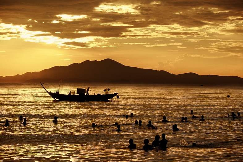 July 31, 2003-- Tourists swim in the South China Sea near a fishing boat as the sun rises near Hoi An, south of Danang. The Vietnamese prefer to swim early in the morning, avoiding the heat and sun of the day. By 9am the beach was empty.