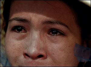 July 31, 2003-- Sarah Haggerty can't hold back the tears as she looks at photographs in the War Crimes Museum in Saigon, Vietnam. The Mascoutah, Illinois resident who is studying politics in Paris, was traveling through Vietnam.