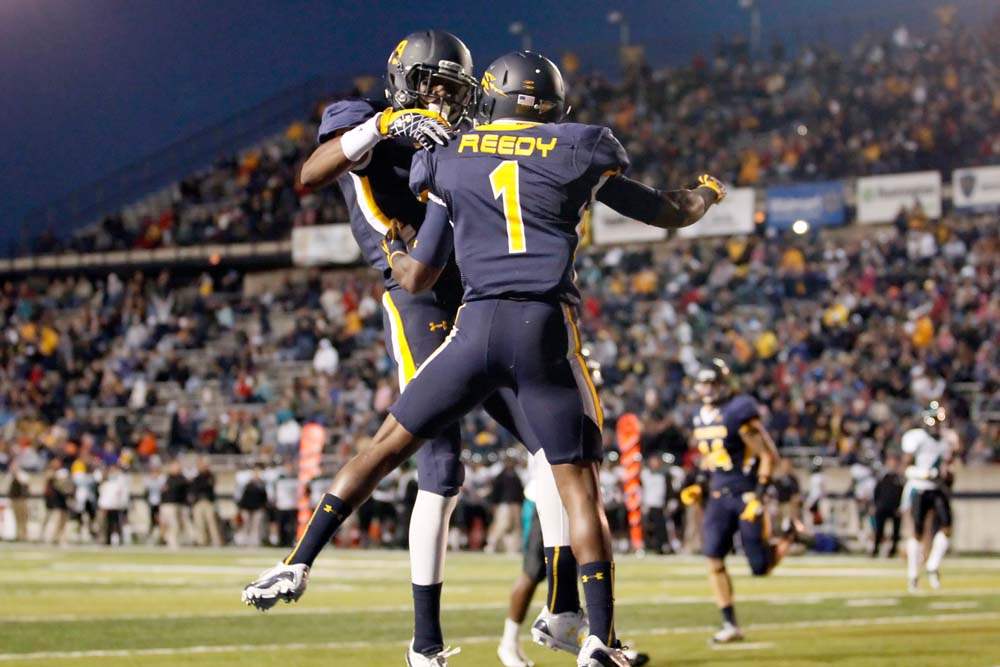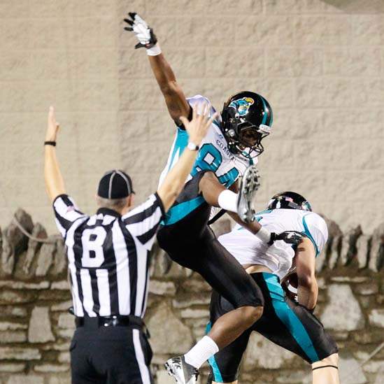 Coastal Carolina players Matt Hazel, 84, and Thomas Pauciello celebrate Pauciello's second quarter touchdown at the Glass Bowl.