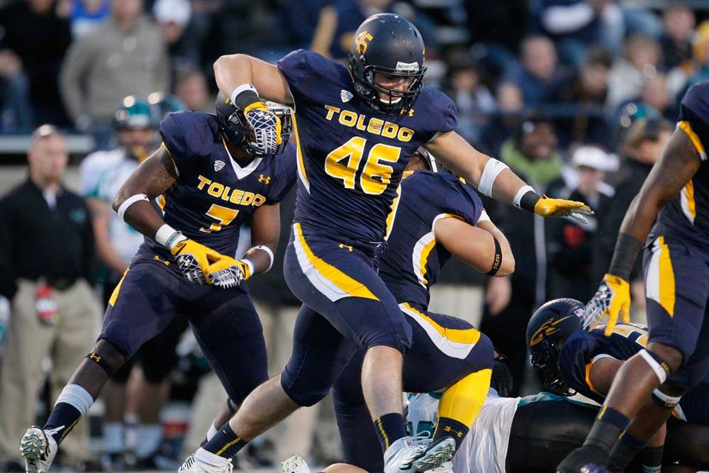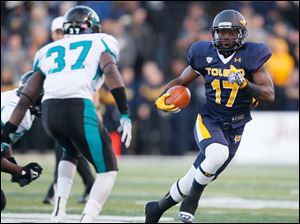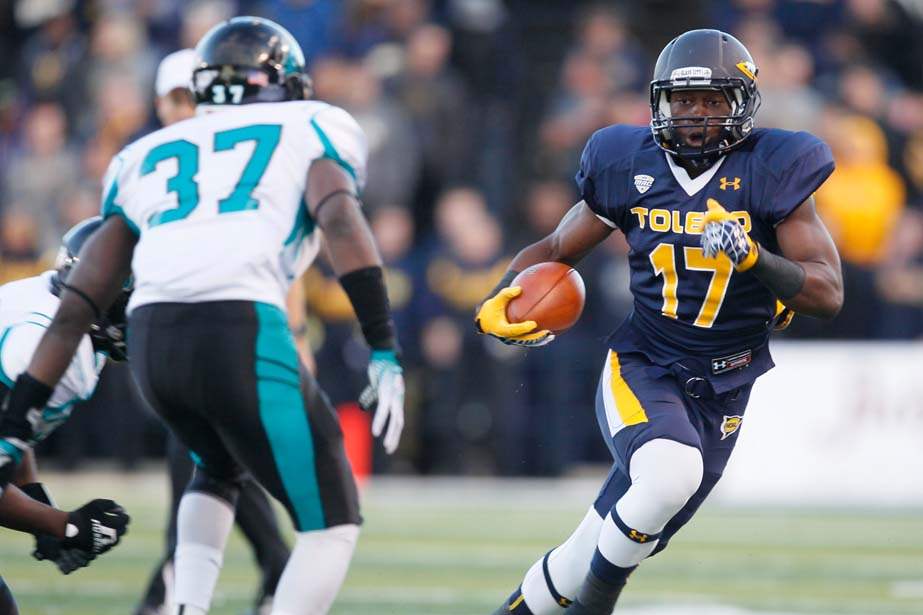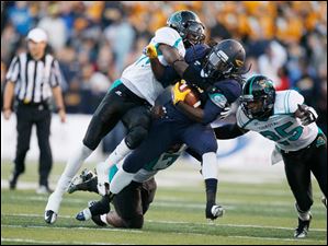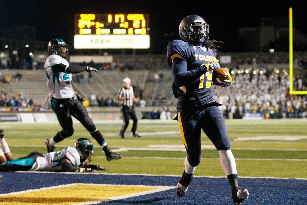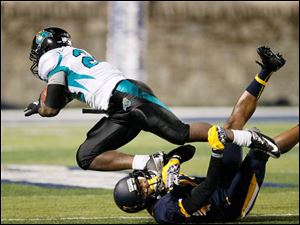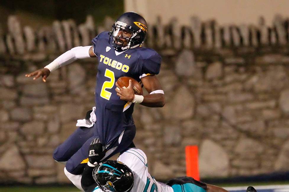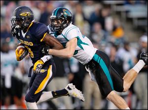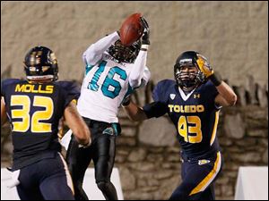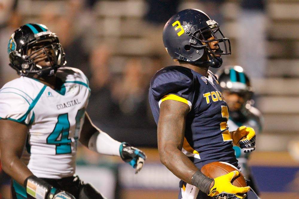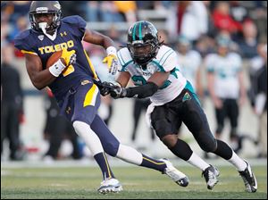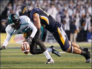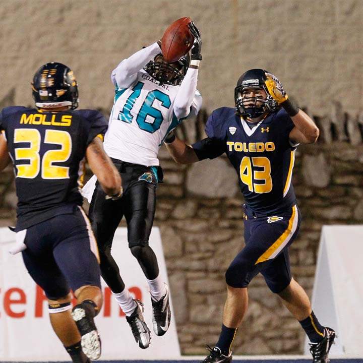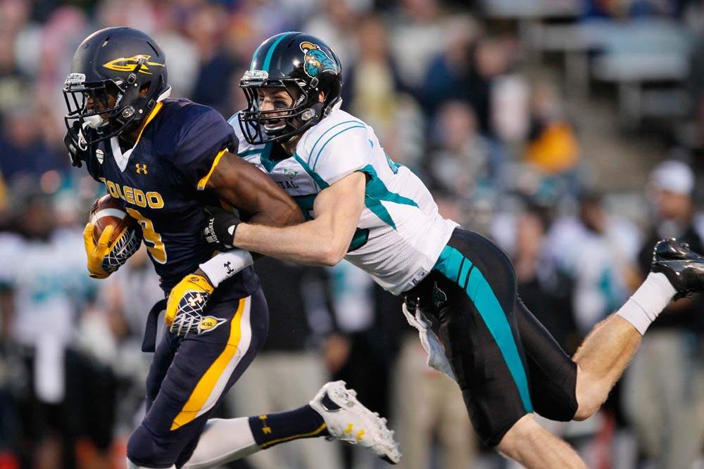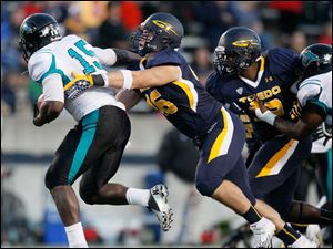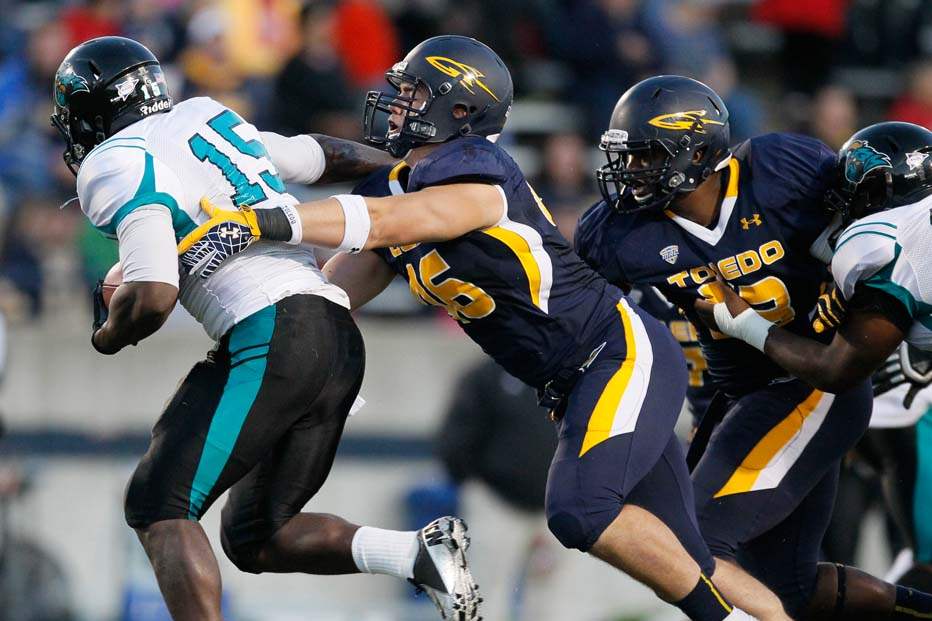University of Toledo's Cheatham Norrils tackles Coastal Carolina's Jeremy Height during the second quarter.