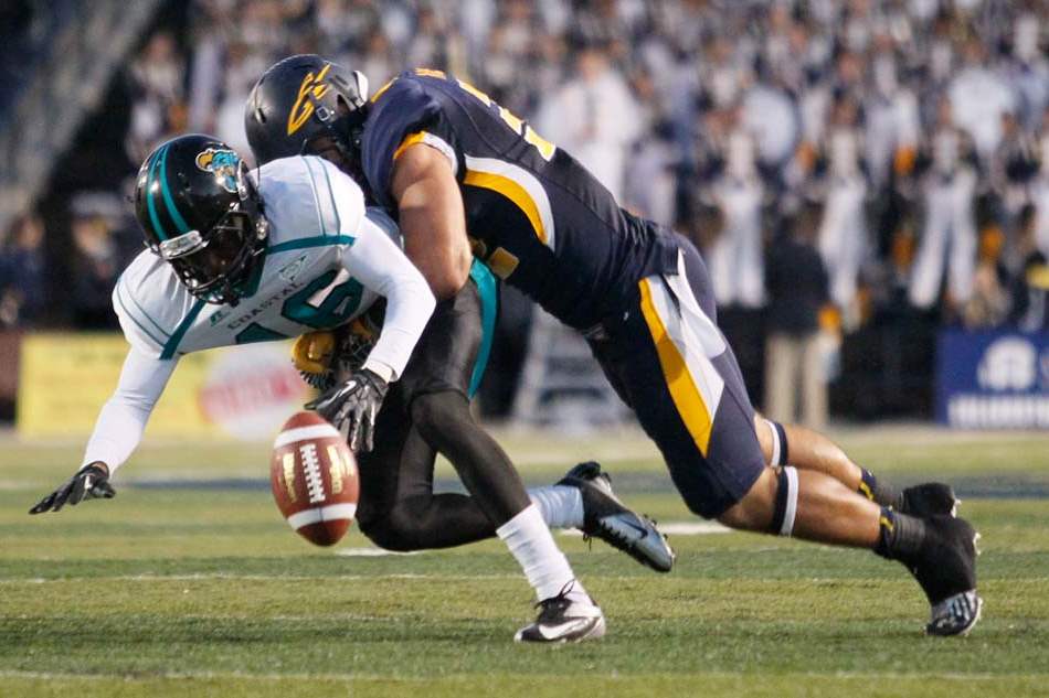Alonzo Russell, 9, picks up a first down before he is shirt tackled by Coastal Carolina's Johnnie Houston, 26.