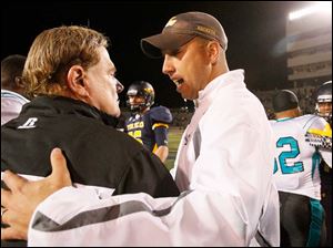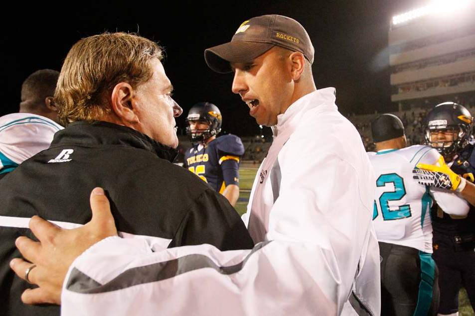 University of Toledo head coach Matt Campbell, right, shakes hands with Coastal Carolina head coach Joe Moglia after the Rockets defeated the Chanticleers 38-28.
