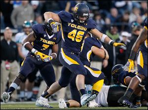 University of Toledo quarterback Terrance Owens, and teammates Cheatham Norrils, 11, and Chris Dukes, 5, stand for the alma mater after defeating Coastal Carolina at the Glass Bowl.