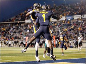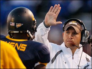 Rockets head coach Matt Campbell high-fives quarterback Terrance Owens after Owens threw a touchdown pass during the first quarter.