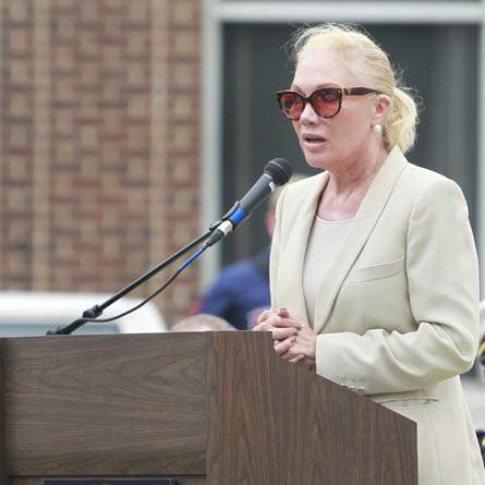 Lucas County prosecutor Julia R. Bates speaks during the Toledo Fire Department's annual memorial service.