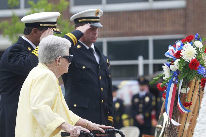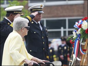 Ethel Bondy, left, looks at a wreath placed as fire chief Luis Santiago, center, and John Kaminski, right, salute it during the Toledo Fire Department's annual memorial service.