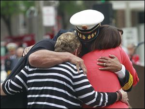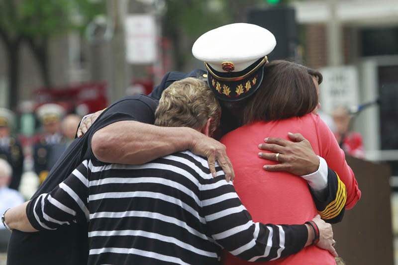 Fire chief Luis Santiago embraces the Dickman family after placing the wreath for James Dickman who was killed earlier this year.
