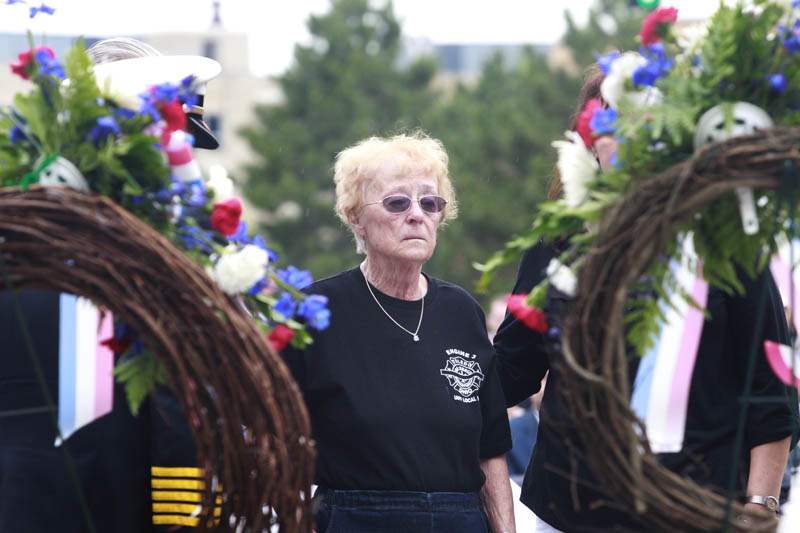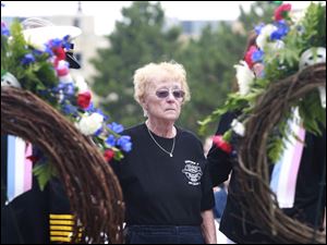 Sharon Machcinski, mother of firefighter Stephen Machcinski, looks at the wreath placed for her son during the Toledo Fire Department's annual memorial service.