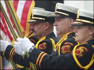 Toledo honor guard member Craig Ellis, center, presents the colors with other honor guard members at the start of the Toledo Fire Department's annual memorial service.