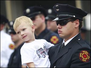 Gavin Getzinger, 4, left, is held by his father Kyle Getzinger during the Toledo Fire Department's annual memorial service.