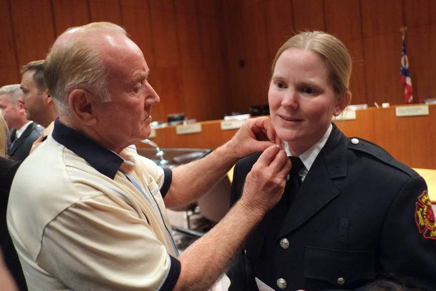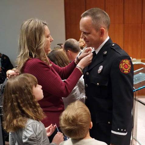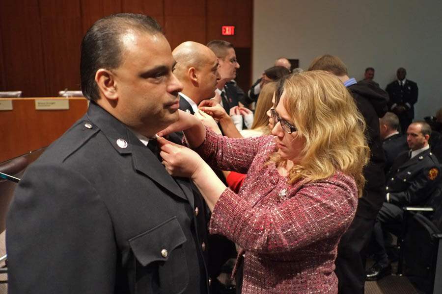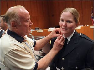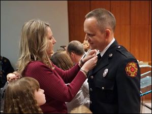 Lynn Rodriguez pins new collar brass on the shirt of her husband, newly promoted Toledo Fire and Rescue Battalion Chief David Rodriguez.