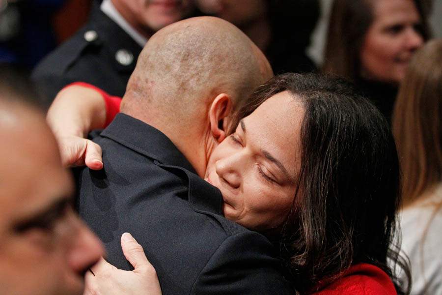 Newly prompted Toledo Fire and Rescue Department battalion chief Damon Williams is embraced by his wife Michelle after she pinned his new collar brass on him.