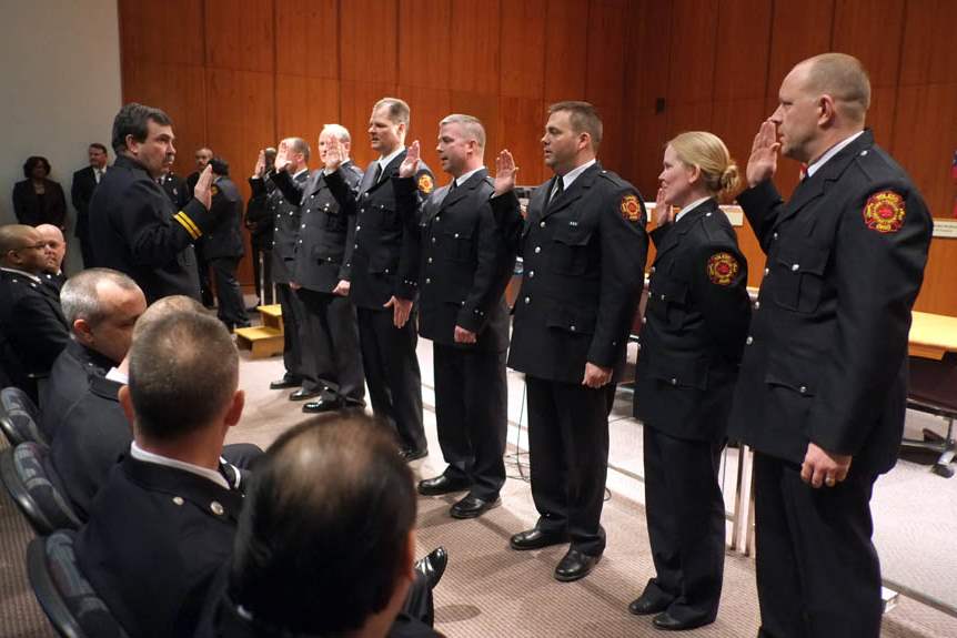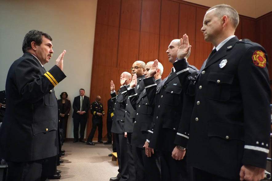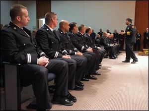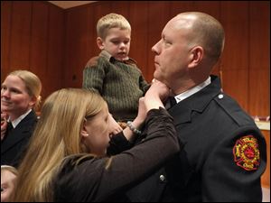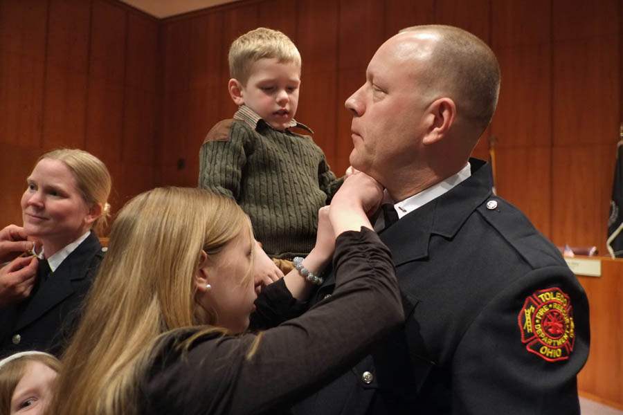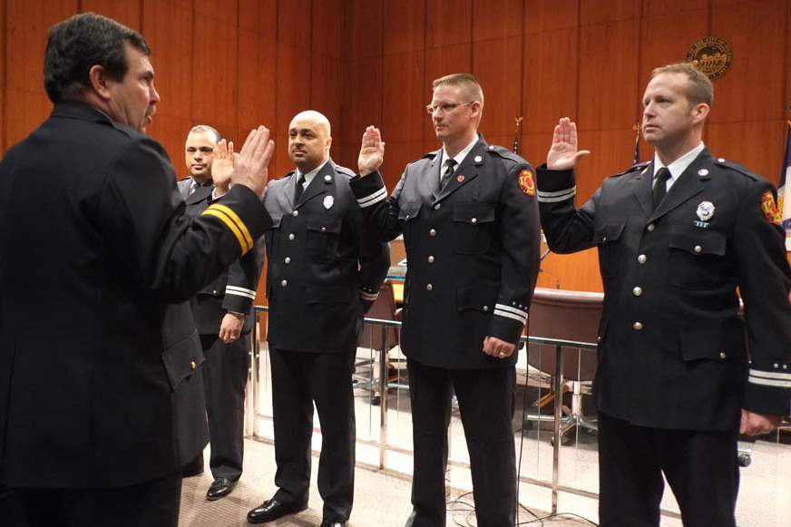David Dauer Toledo Fire and Rescue Department CFO and battalion chief, left, swears in newly promoted captains.