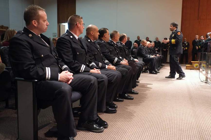 Toledo Fire Chief Luis Santiago addresses members of the Toledo Fire and Rescue Department being promoted. From left are captains John Kaminski, Timothy Clapp, Damon Williams and David Rodriguez, who were all promoted to battalion chiefs.