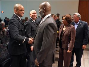 Newly promoted Captain Dexter Baker, left, is congratulated by Toledo Mayor Mike Bell.