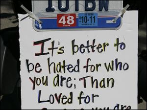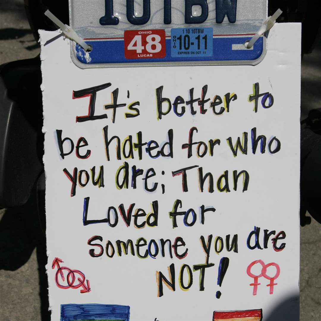 This sign was on the back of one of the motorcycles that led the Toledo Gay Pride parade.