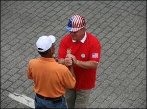 Dennis Duffey, of the International Brotherhood of Electrical Workers Local 8, right, greets Frank Badgett of West Toledo.