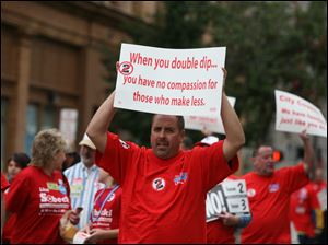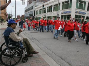 Former Toledo Mayor Jack Ford, left, watches as members of the Toledo Federation of Teachers march by in the Labor Day parade. He was greeted warmly by the crowds.