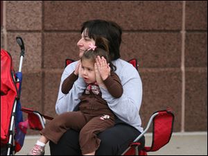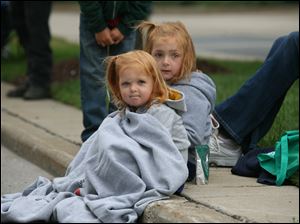 Two-year-old Lucy Printke and her mother Lauren Printke of West Toledo brave the cold winds to watch the 2011 Labor Day parade.