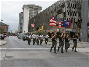 Officers of the Lucas County Sheriff's Department march down the street carrying the American, Ohio, Lucas County, and sheriff's department flags.