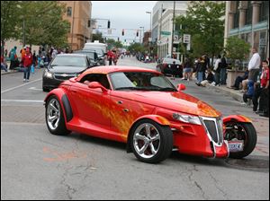 A Chrysler Prowler with a flame paint job, glides down the streets of Toledo.