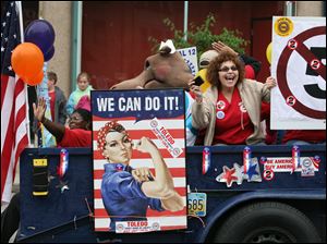 UAW stickers adorn a Rosie the Riveter sign on one of the Labor Day parade floats.