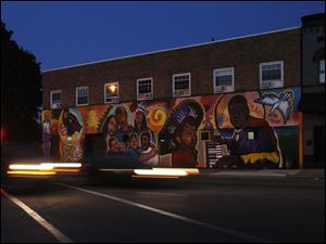 A mural by BGSU students in the 1200 black of Broadway represents local people.