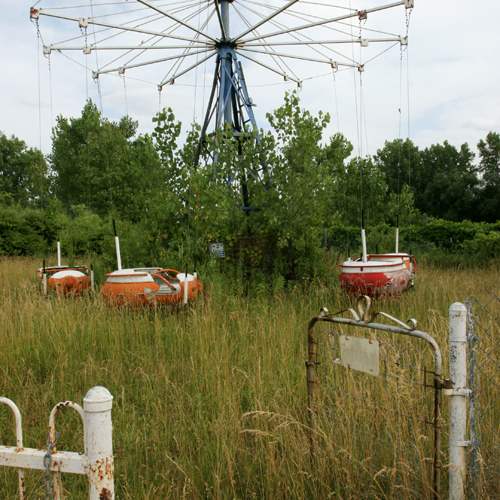 Birds perch on the framing of a ride at Enchanted Forest Playland, perhaps wondering when the grounds might again be covered in popcorn falling from children's hands.