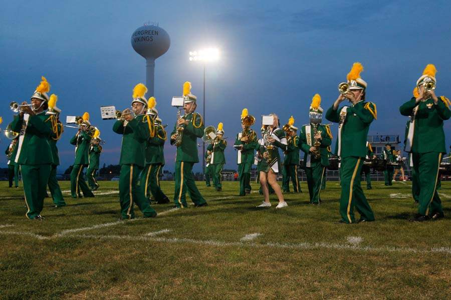 Cheerleader and saxophone player Erica Harmen joins the band during halftime. 15 football players and seven cheerleaders are Evergreen High School band members.