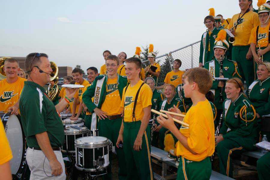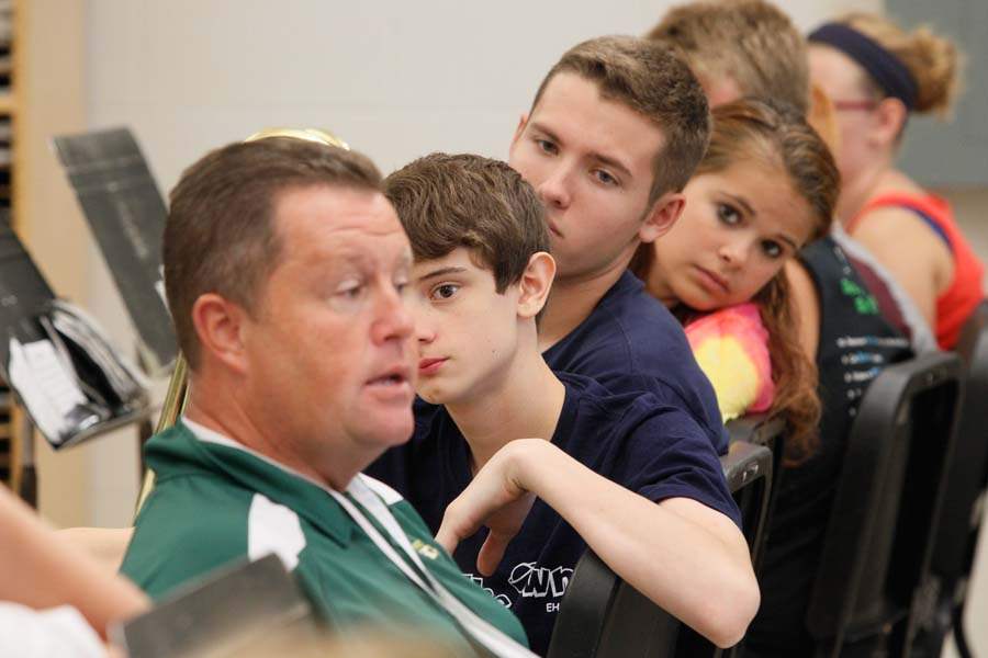 Band Director Chris Lyons speaks to the Evergreen band members on Aug. 5, the first day of band camp. When Lyons started 23 years ago, there were 13 students in the band. About 120 students from ninth to 12th grade are in the band.