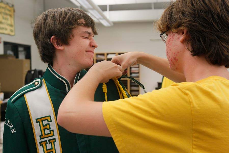 First year high school band member Dillon Buck, left, gets help with his uniform cord from Darin Kurland.