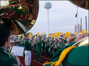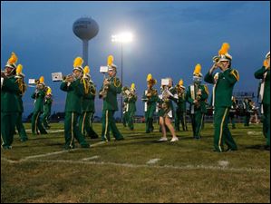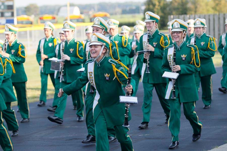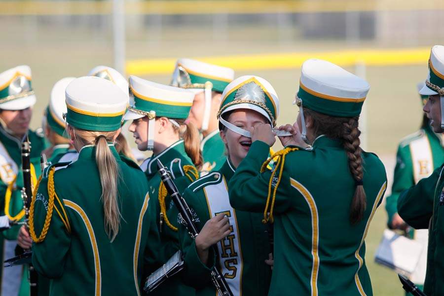 Snare drummer Kyle Harmon and other members of the drumline get funky after performing their halftime show at Evergree's first home game in Metamora on Aug. 30.