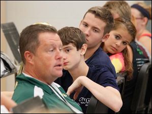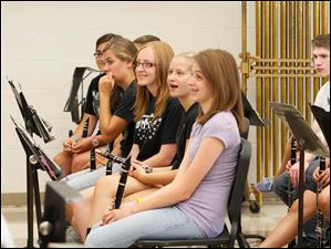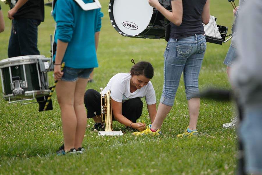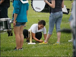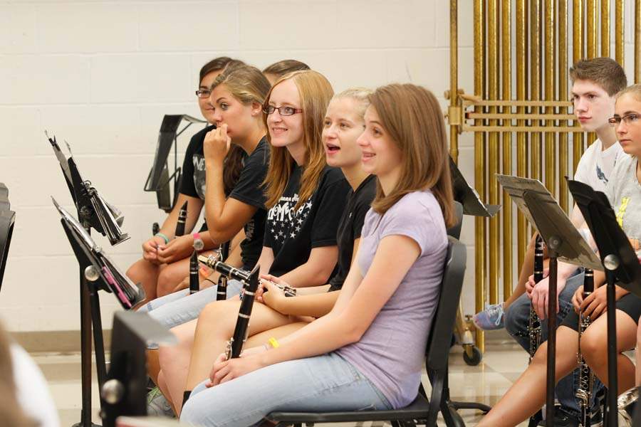 Anna Ruth, left, Chelsey Miller And other members of the band during practice huddle to hear their director's instructions on the last day of band camp.