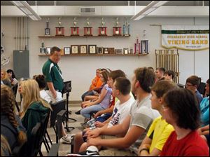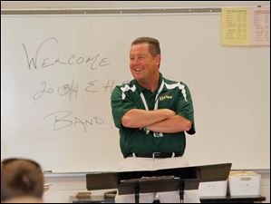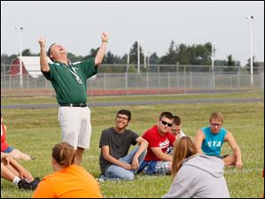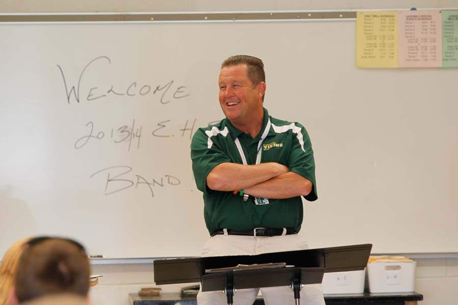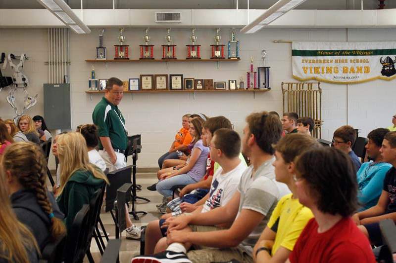 Evergreen band director Chris Lyons welcomes students to band camp. Self-deprecating humor, candor, and respect are Lyons' tools with the students.