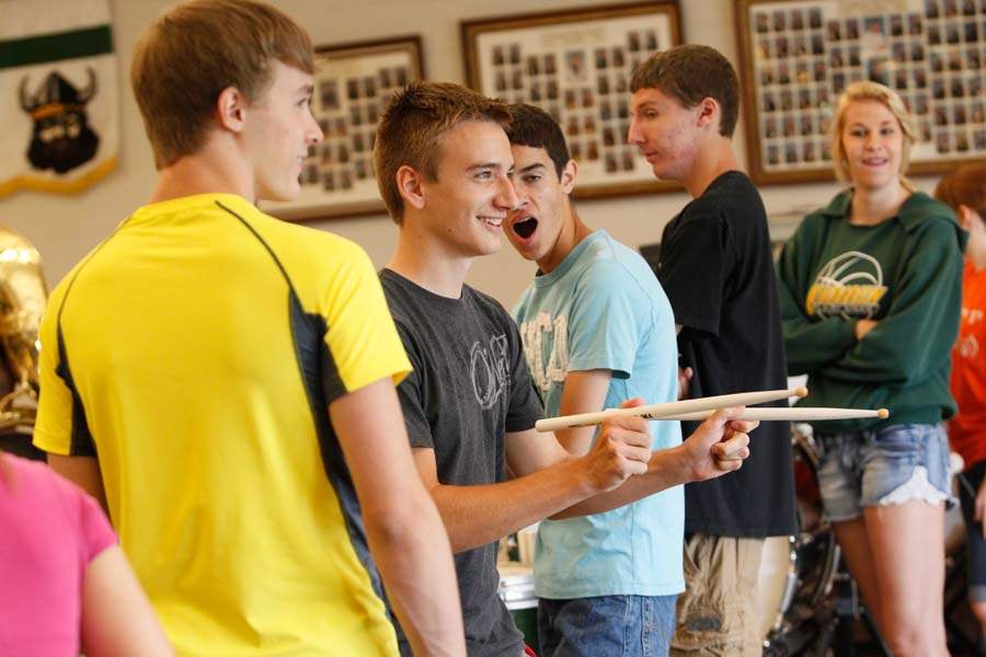 Evergreen drumline members Ross Shaffer and Haley Reiter, at back, watch as Jake Dowling plays around with his sticks.