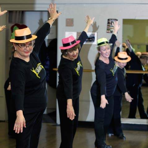 Dancers, including Ann Smith, left, use hats during a swing dance during adult tap lessons.