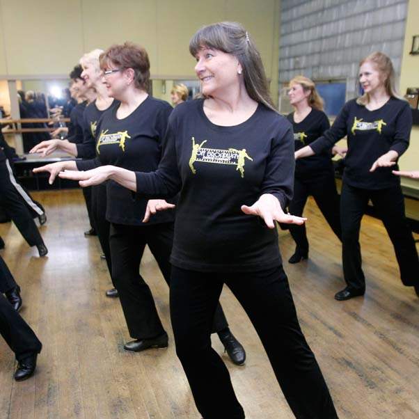 From left: Shirley Baumgartner, Becky Holmes, and Jeanean Perkey swing dances during adult tap lessons.