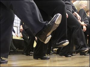 Dancers perform a scuff step during adult tap lessons at Off Broadway Dance Company at Common Space in Toledo.