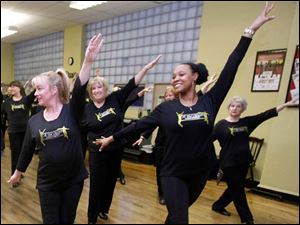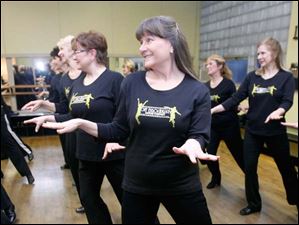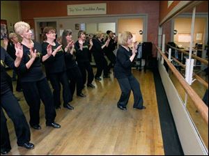 Jeanean Perkey, left, and Kristy Sprague prepare to enter a kick line during adult tap lessons.
