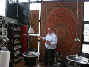 University of Toledo's Mark Schroeder in the Nordwolle Museum in front of a linoleum piece that resembles a tapestry.